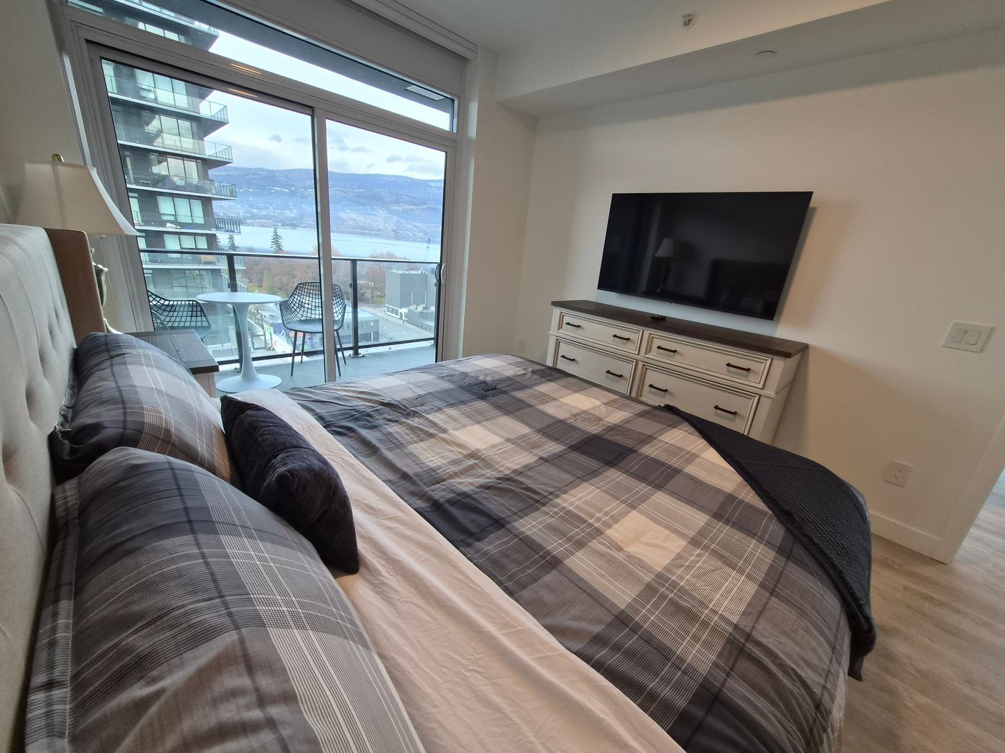 Newly built Water Street by the Park towers. Kelowna's premier new downtown location. Desirable northwest facing two bedroom, two bath home with bridge, lake, and mountain views. Spacious living area with gourmet kitchen featuring premium appliances, gas range, quartz countertops, marble porcelain tile work, luxury vinyl plank flooring, and quality finishes throughout. Massive wrap around deck to take advantage of stunning views. In-suite laundry. Primary bedroom large enough for king bed, has walk-through closet and ensuite. Unit comes with one underground parking stall. Unit is fully stocked with linens, cookware, utensils, Keurig coffee machine, blender, etc.