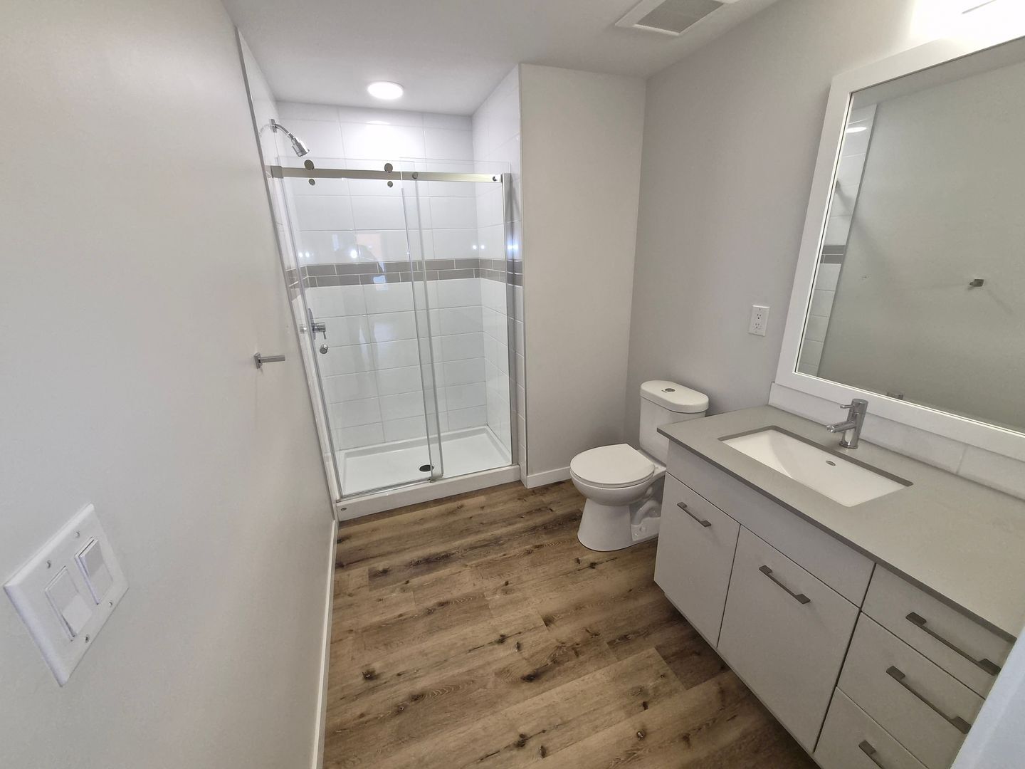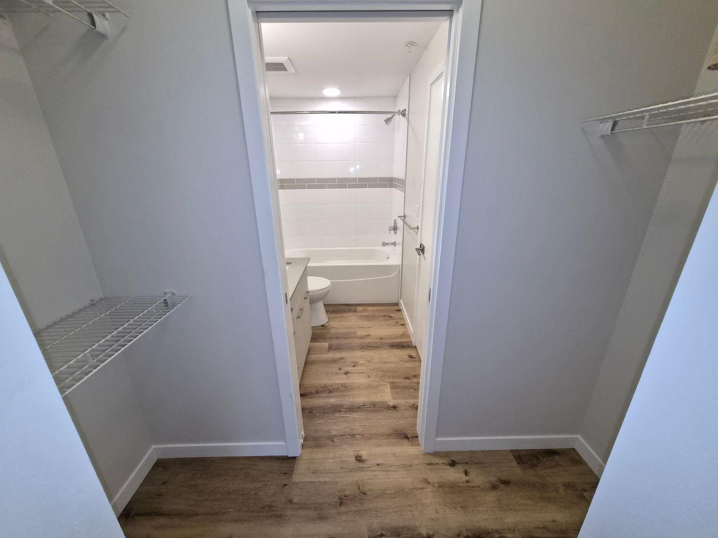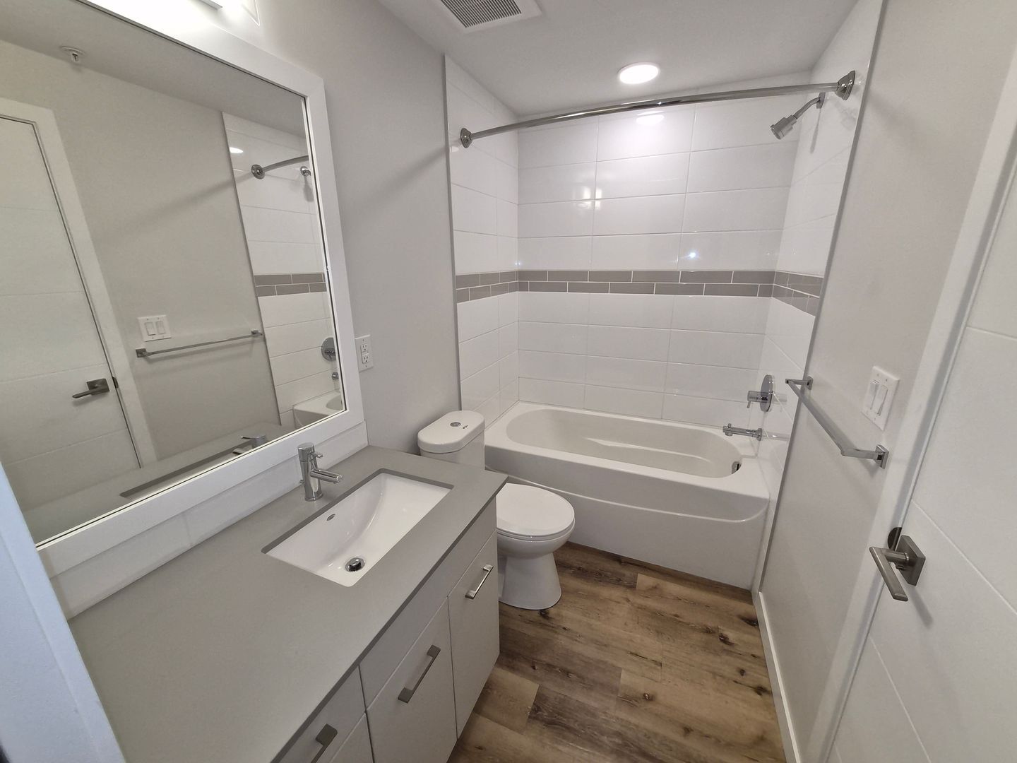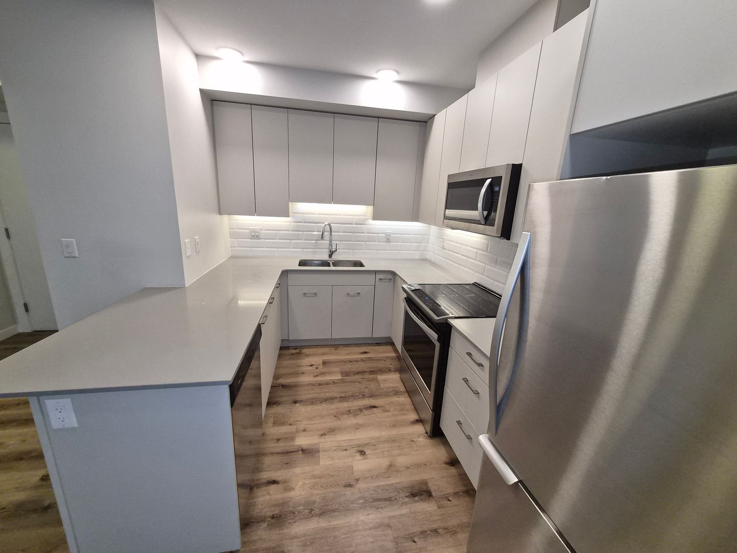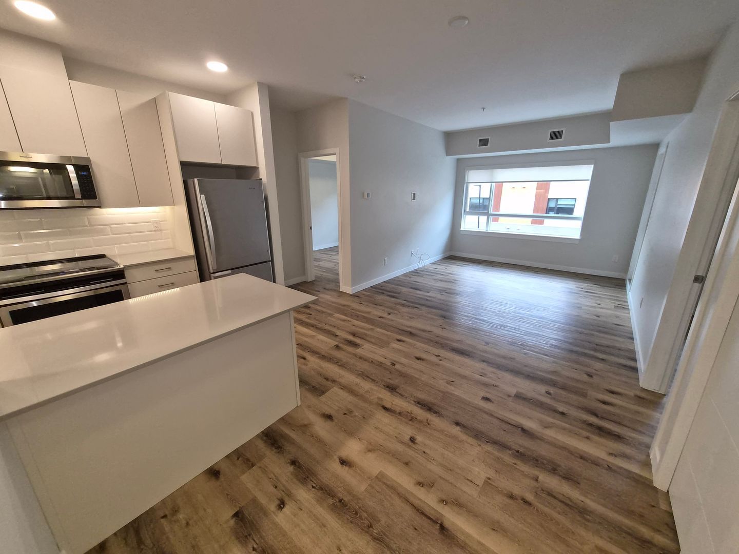 Luxury 2bed/2bath condo on 2nd floor. Open concept with gourmet kitchen, stainless steel appliances and quartz counter tops throughout. Master has walk-through closet and ensuite. In-suite laundry, blinds included, unit patio and shared rooftop patio, indoor bike garage, guest suite, social room, car-share program, dog wash station. Approx 900 sq ft - comes with one underground parking stall. Close to shopping, pubs, golf, public transport, parks, trails, and schools. Hot water included - utilities are extra.