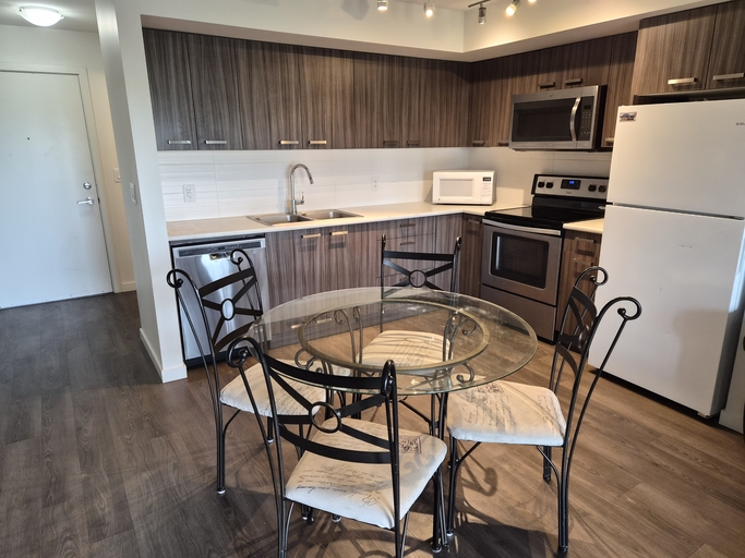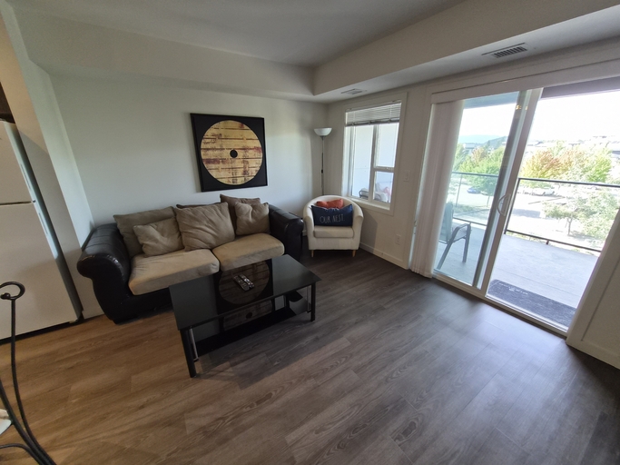 Two bedrooms and 2 bathrooms condo (727 sq.ft.) on the 3rd floor, with a spacious balcony. It is located next to the UBC Okanagan (U –Three development). The unit has central air conditioning, equipped with all living and bed room furniture (Queen and double beds), flat screen LED TV, computer desks, self-contained washer and dryer, stainless steel appliances, dining table and chairs. Kitchen includes a dishwasher and all pots, pans, cookware and cutlery. Covered parking for one car is available.