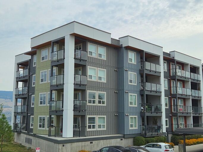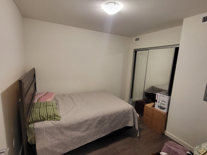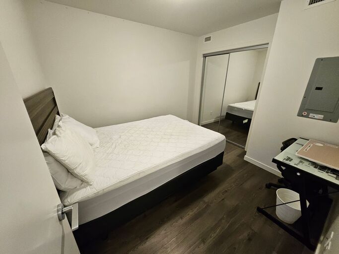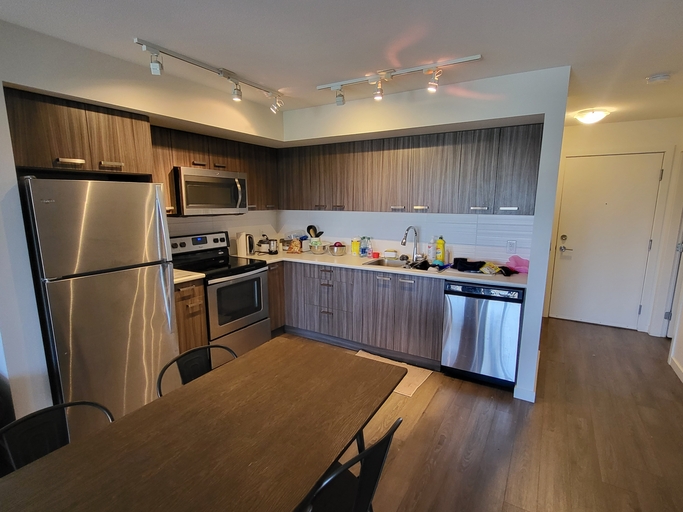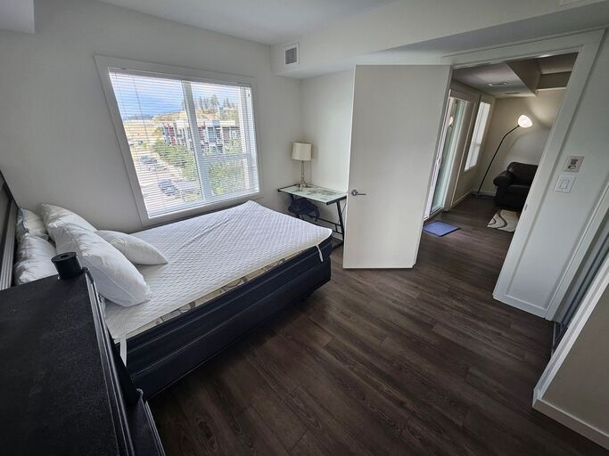 Two bedrooms and 2 bathrooms condo (Approx 800 sq.ft.) top floor penthouse unit, with a spacious balcony. It is located next to UBC Okanagan (U –Three development). The unit has central air conditioning, equipped with all living and bed room furniture, flat screen LED TV, computer desks, self-contained washer and dryer, stainless steel appliances, dining table and chairs. Kitchen includes a dishwasher and all pots, pans, cookware and cutlery. Covered parking for one car is available.